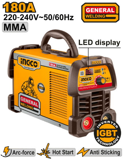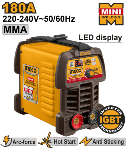 SKU: INGC 240V 180A Inverter MMA welding machine , ING-MMA13049 Category: Welding Machine Tags: 15–130A inverter welder, 240V MMA welding machine, anti-stick arc welder, arc-force welder, compact inverter welder, electrode holder and earth clamp included., hot start welding machine, INGCO ING-MMA13049, INGCO welding tools., LED display MMA welder, professional welding equipment, wire brush included