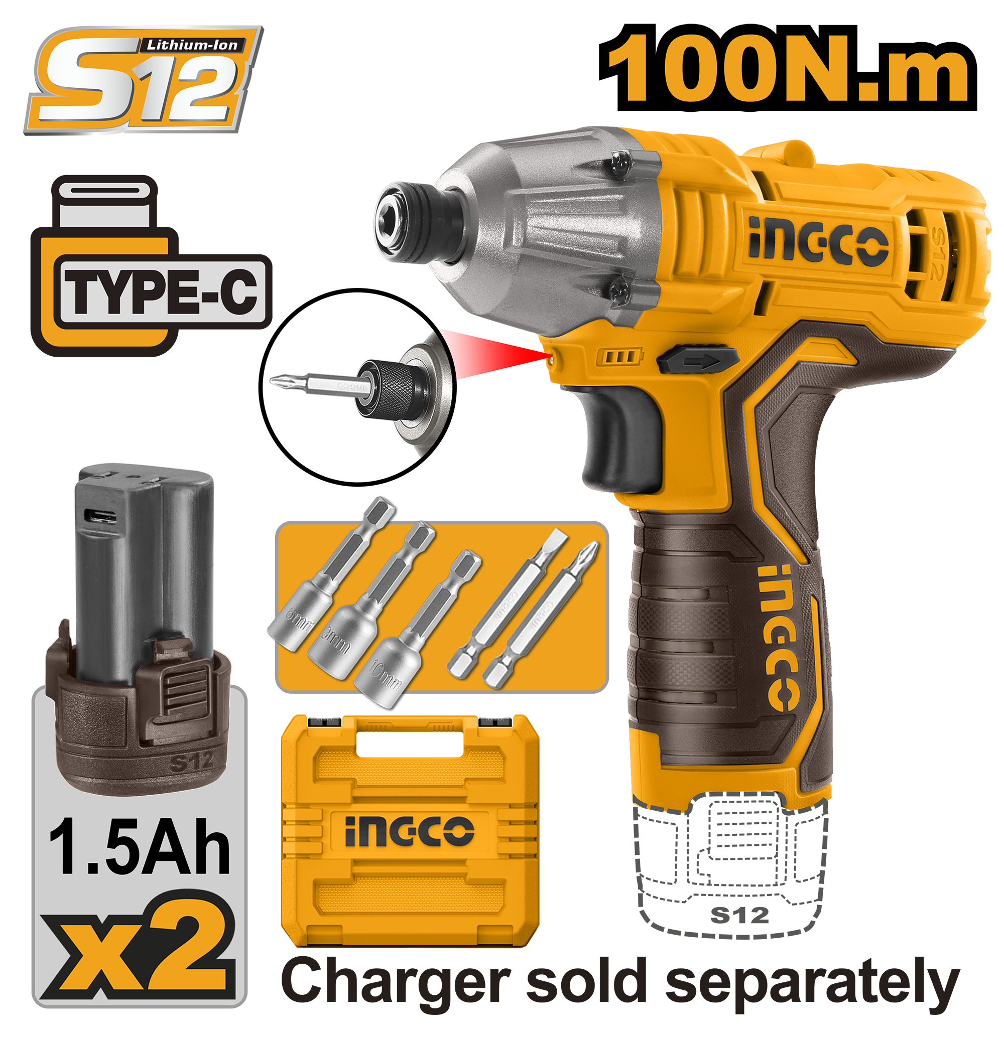 The INGCO 100N.M Cordless Impact Driver (Model: CIRLI12015) is a powerful and compact tool designed for professional and DIY fastening tasks. Powered by a 12V battery system, it provides high torque and precision for driving screws, bolts, and nuts efficiently.