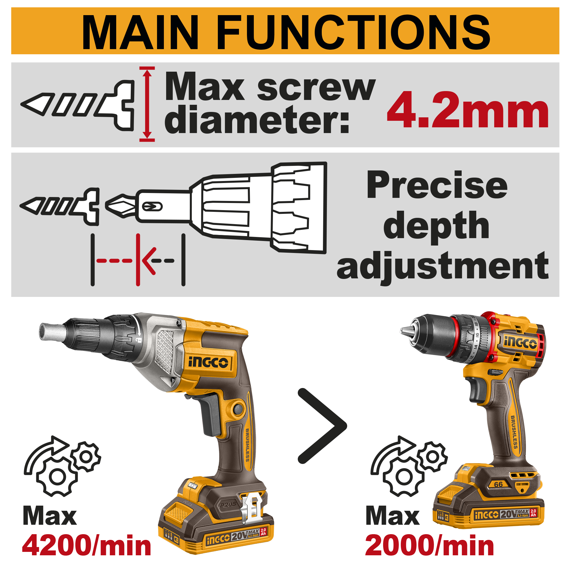 INGCO CDSLI204281 20V Cordless Drywall Screwdriver delivers efficient fastening with a 6.35mm (1/4″) hex bit and no-load speed up to 4200rpm. Ideal for drywall installation and professional use.