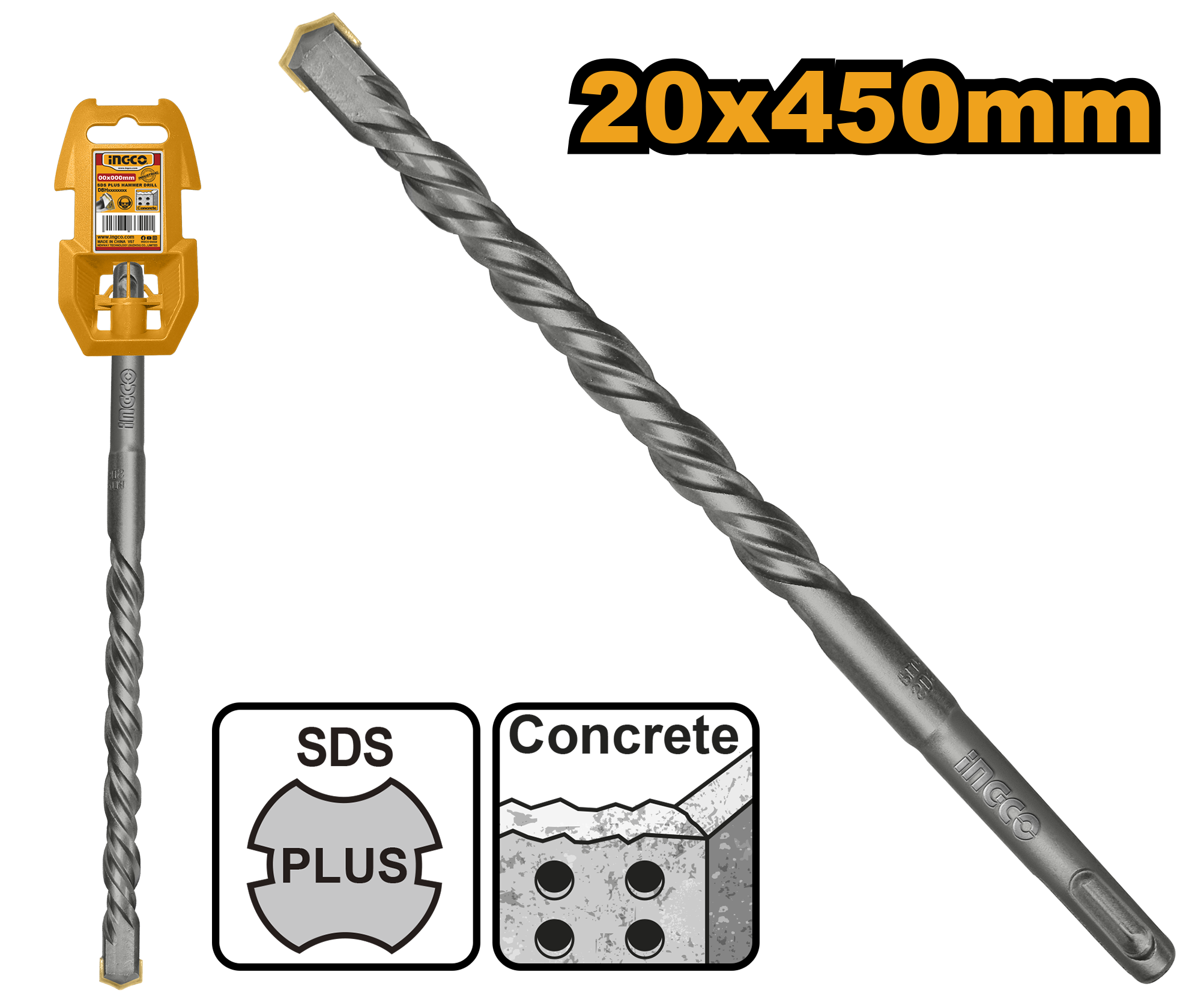 The INGCO 20×450MM SDS Plus Hammer Drill Bit (DBH1212004) is built to handle demanding drilling tasks in concrete, brick, stone, and masonry surfaces. Equipped with an SDS Plus shank, it allows fast bit changes, secure locking, and efficient impact energy transfer from the hammer drill.