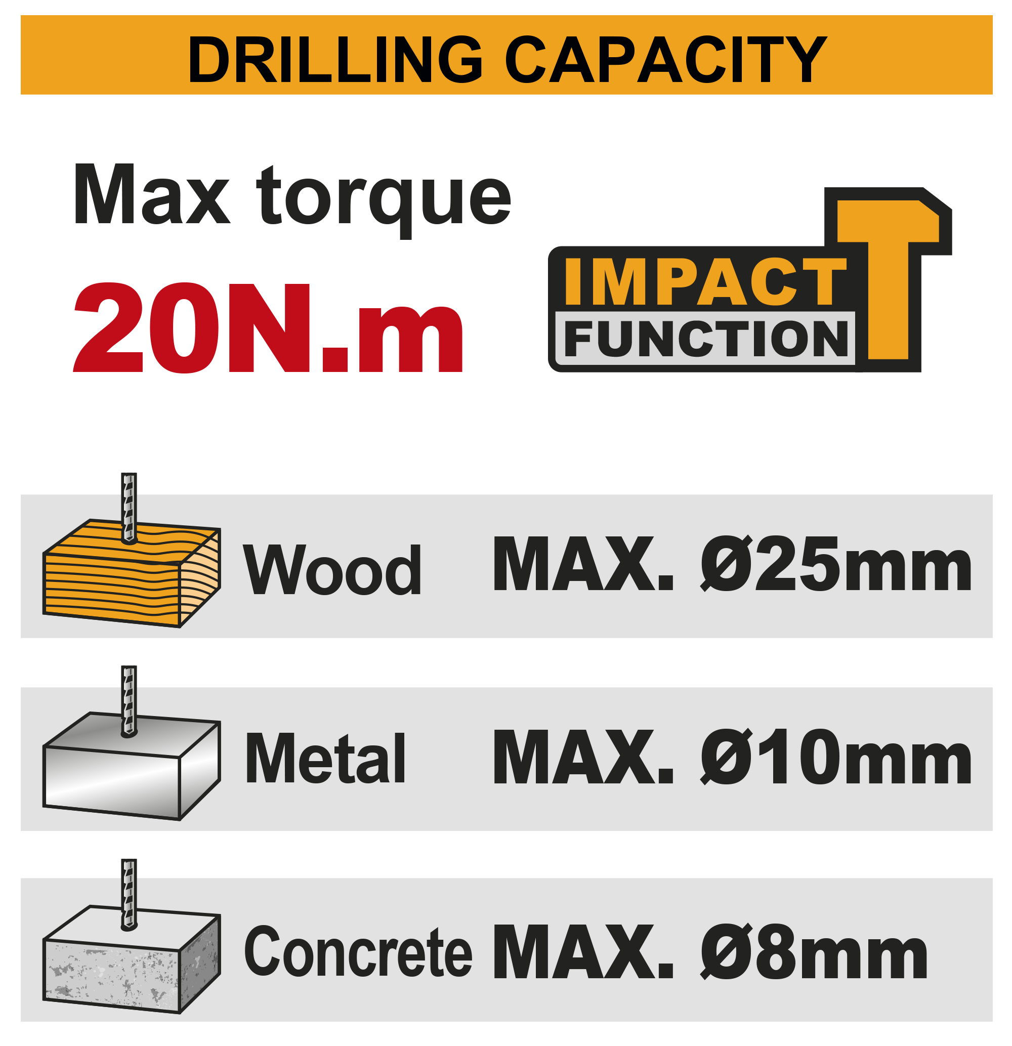 Delivering a solid 25Nm of torque, this impact drill ensures efficient performance for a variety of applications. From driving screws into wood to drilling through metal or plastic, it delivers the power you need with ease.