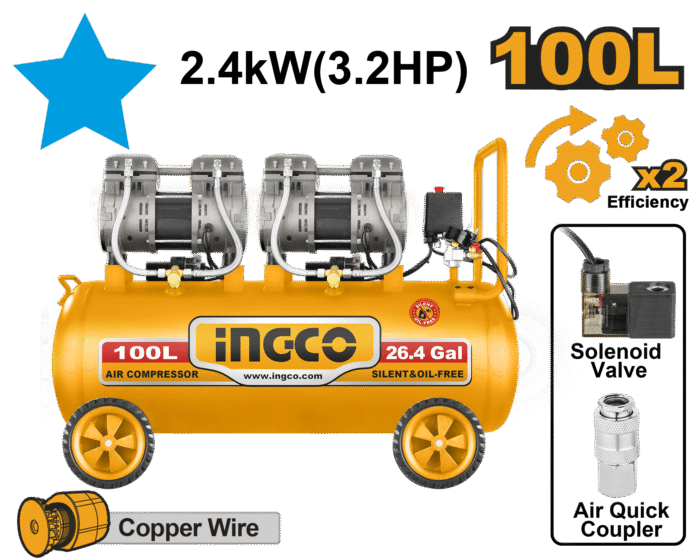The INGCO 3.3HP 100L Air Compressor (ACS2241001) features a 2×1200W oil-free system, 2850rpm speed, max 8bar pressure, and 75dB noise level. Tank capacity 100L, copper wire motor, packed in a plywood case.