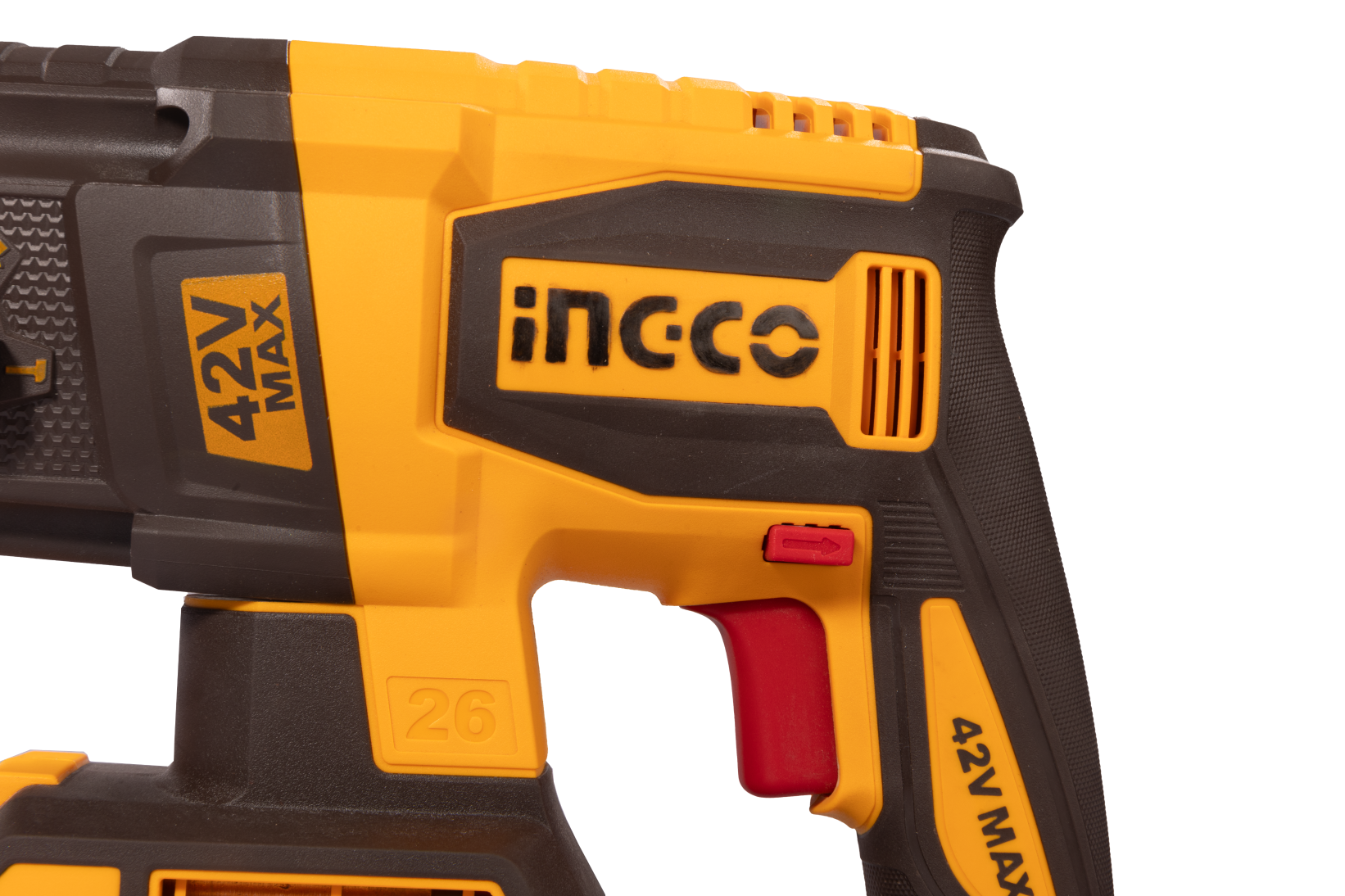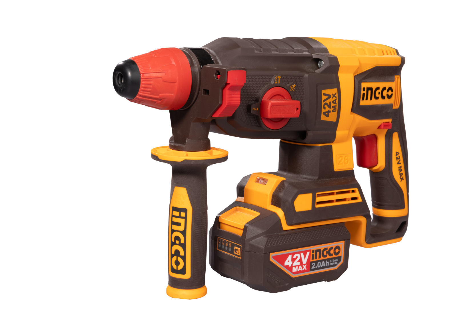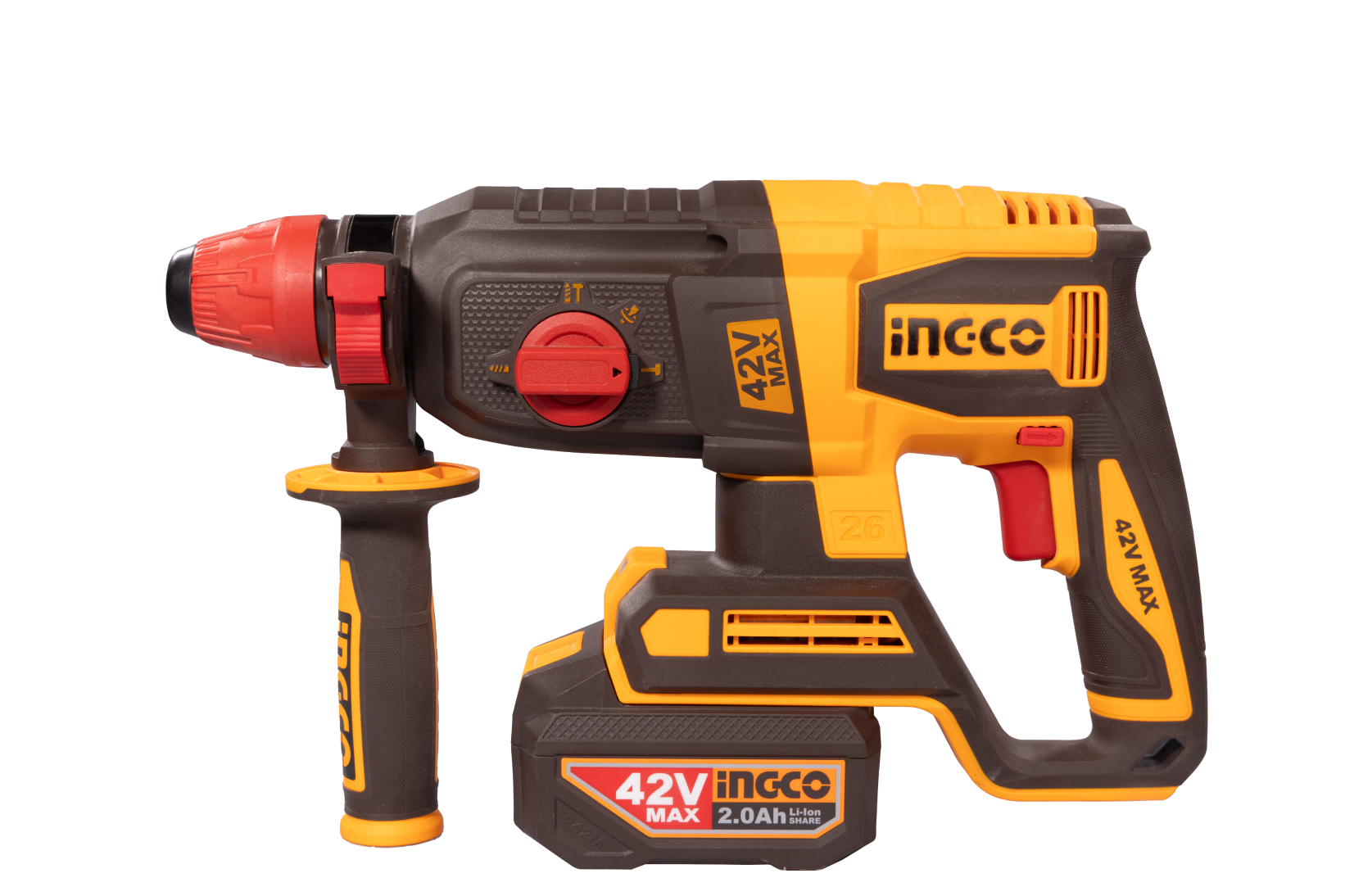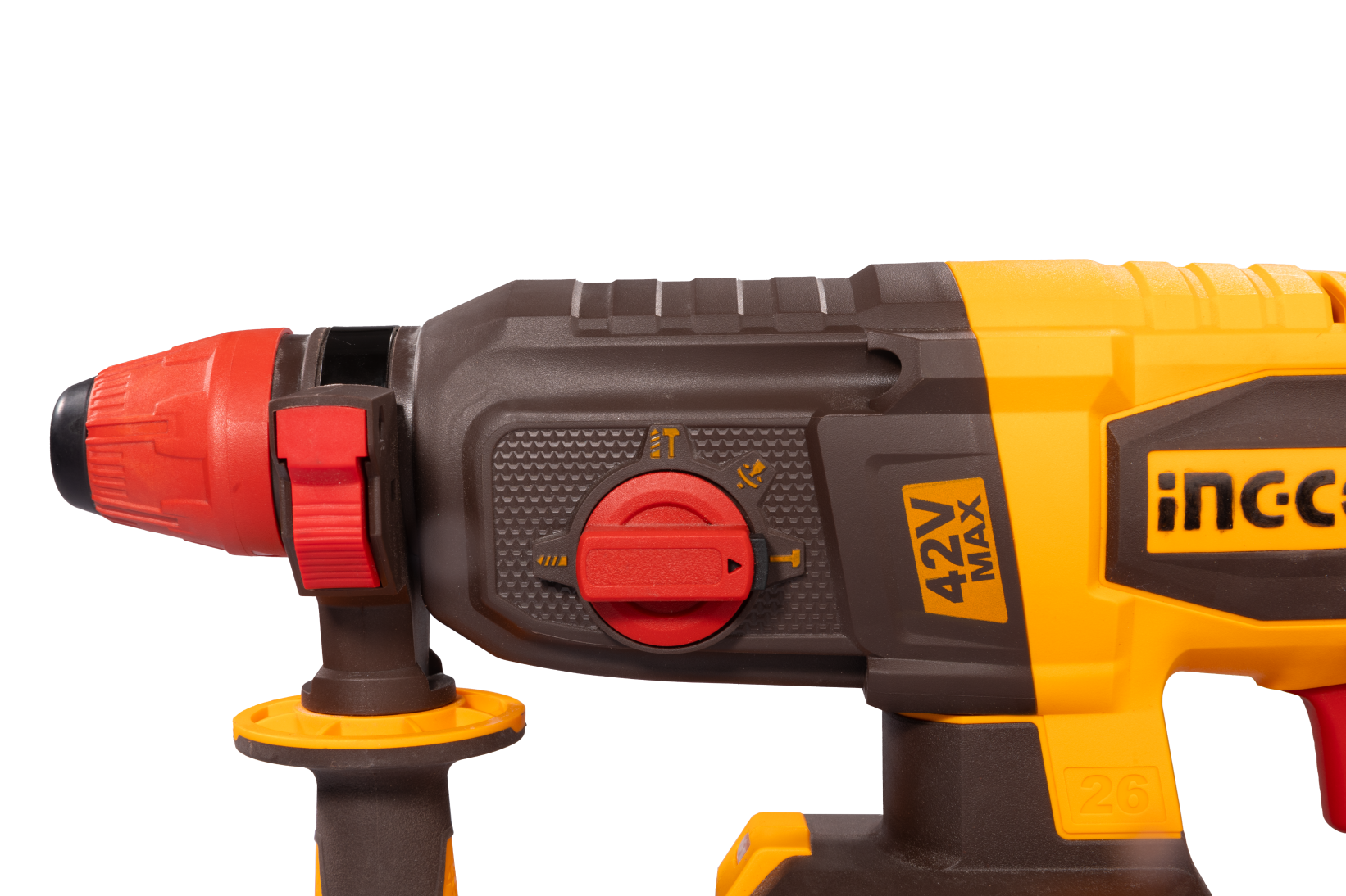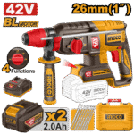 The INGCO 42V 26mm Cordless Rotary Hammer (CRHLI422682) is a professional-grade tool designed for heavy-duty drilling in concrete, steel, and wood. Powered by a brushless motor, it delivers 2.5J of impact energy and an impact rate of 0–5000 bpm, making it ideal for demanding construction and renovation tasks.