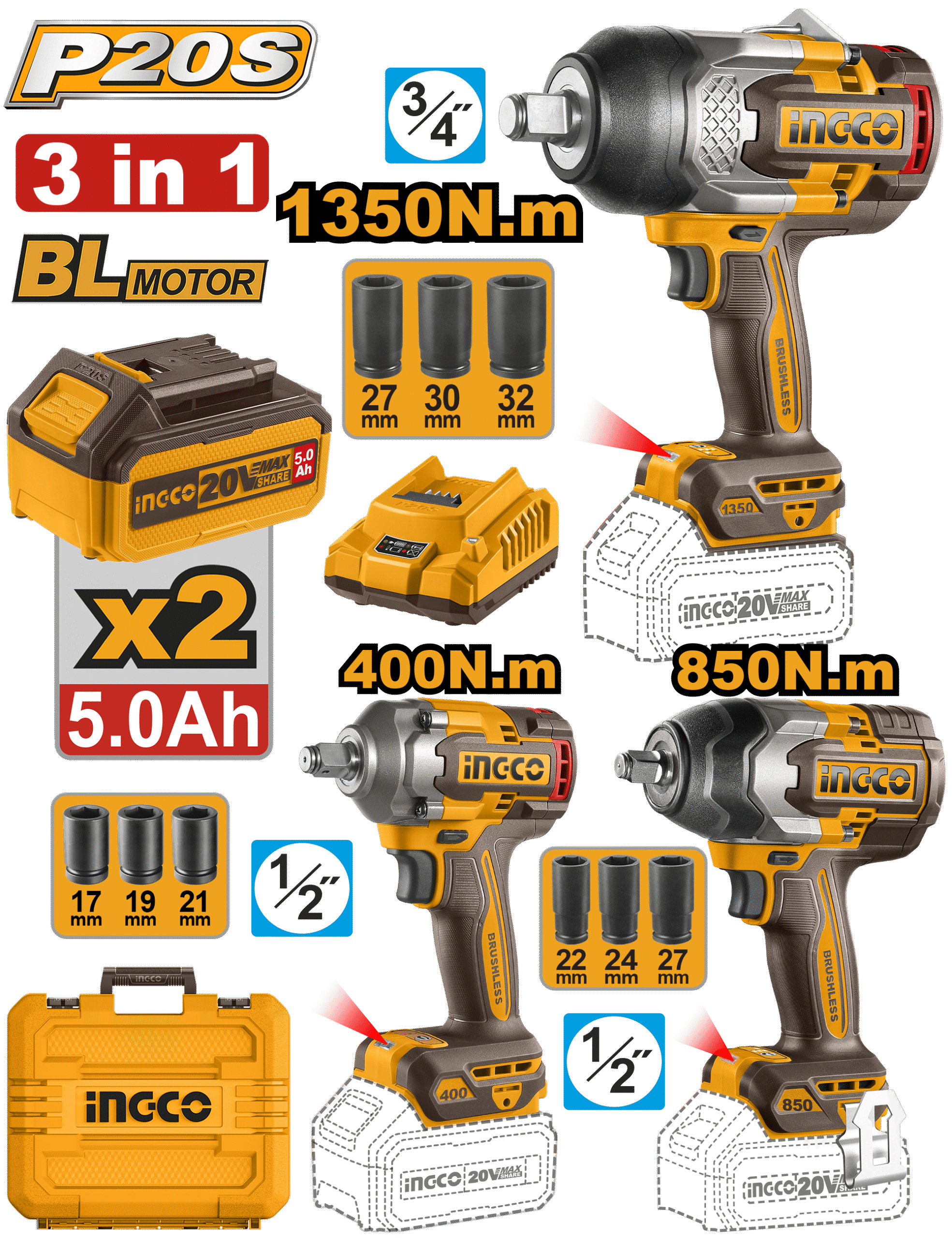 The INGCO COSLI250386 P20S Cordless 3-Pcs Combo Kit is the ultimate solution for professionals who require a complete impact wrench lineup in one package. Powered by the P20S 20V platform, this combo includes: