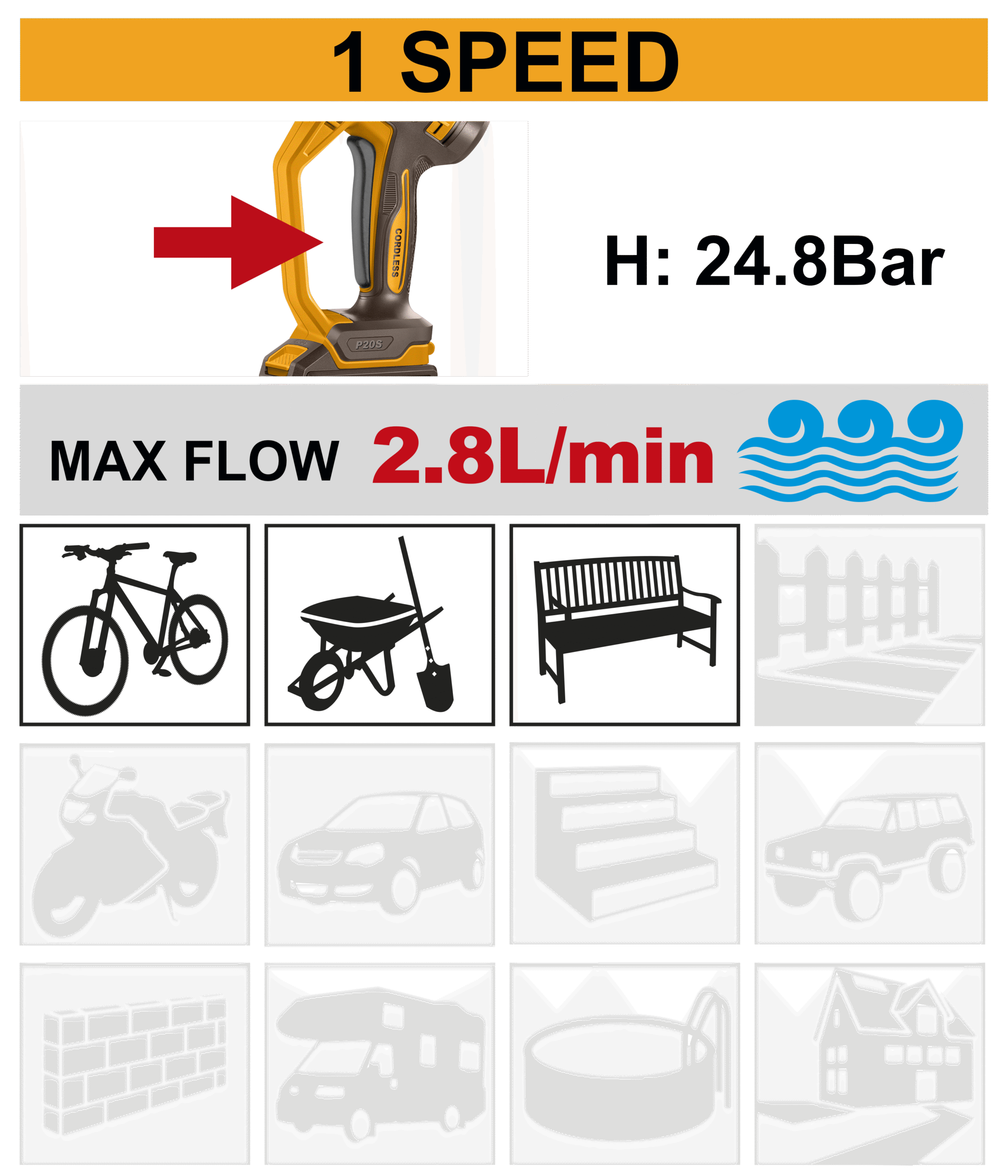Tags: 2.8L/min flow washer, 20V battery pressure washer, 24.8Bar high-pressure washer, 2Ah battery pressure washer, auto-stop washer, car cleaning washer, cordless cleaning tool, CPWLI20362, foam spray washer, garden pressure washer, High-pressure cordless washer, home cleaning tool, INGCO cordless pressure washer, INGCO P20S tool, Lightweight pressure washer, outdoor washer, P20S pressure washer, portable cleaning device, Portable pressure washer, rechargeable washer