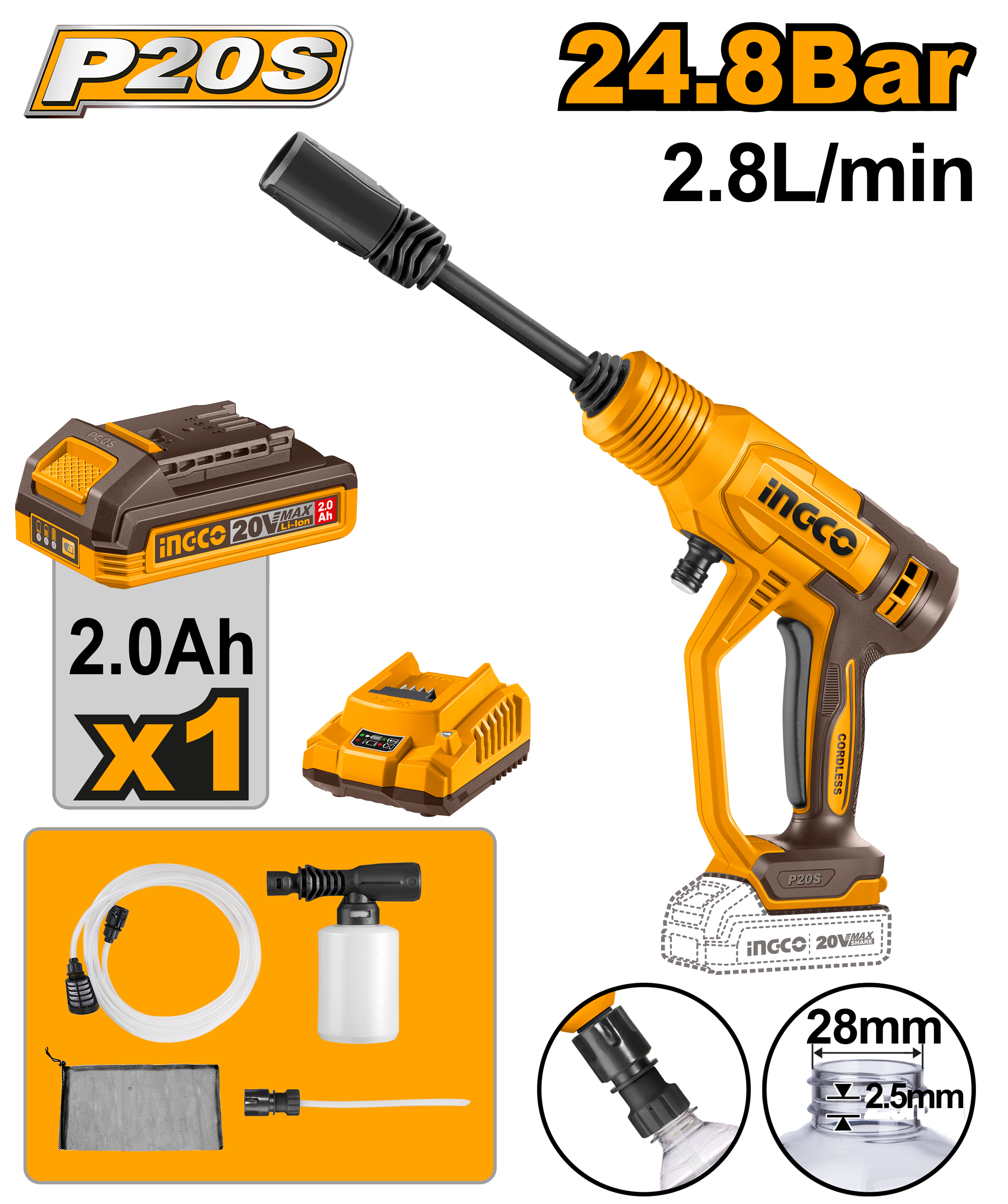 The INGCO P20S 2.8L Cordless Pressure Washer (CPWLI20362) delivers up to 24.8Bar pressure with a 2.8L/min flow rate. Features an auto-stop system and includes a 2-pattern spray gun, 6m hose, foam producer, self-suction connector, portable bag, and 2Ah battery.