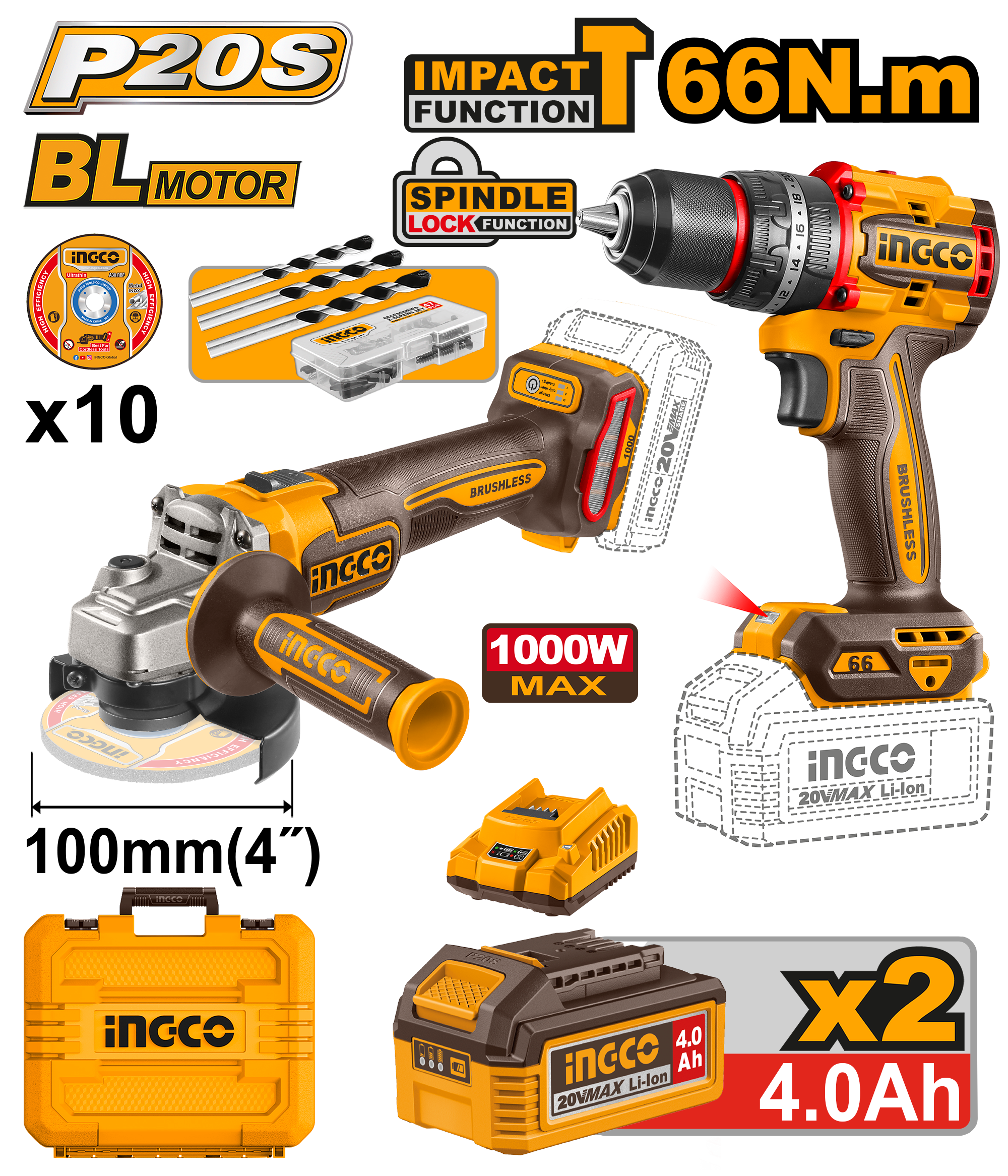 This combo kit delivers exceptional performance, efficiency, and convenience with the P20S 20V platform, allowing you to use the same batteries across multiple tools. Perfect for construction, workshop, and DIY projects requiring both drilling and grinding capabilities.