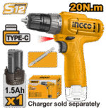 INGCO 12V Cordless Drill (CDLI12456) – Compact and efficient drill with 20Nm torque, 15+1 torque settings, and 0–750rpm speed. Features a plastic chuck, USB Type-C charging port, and includes a 1.5Ah battery pack and 65mm Cr-V bit. Perfect for DIY and light professional tasks.