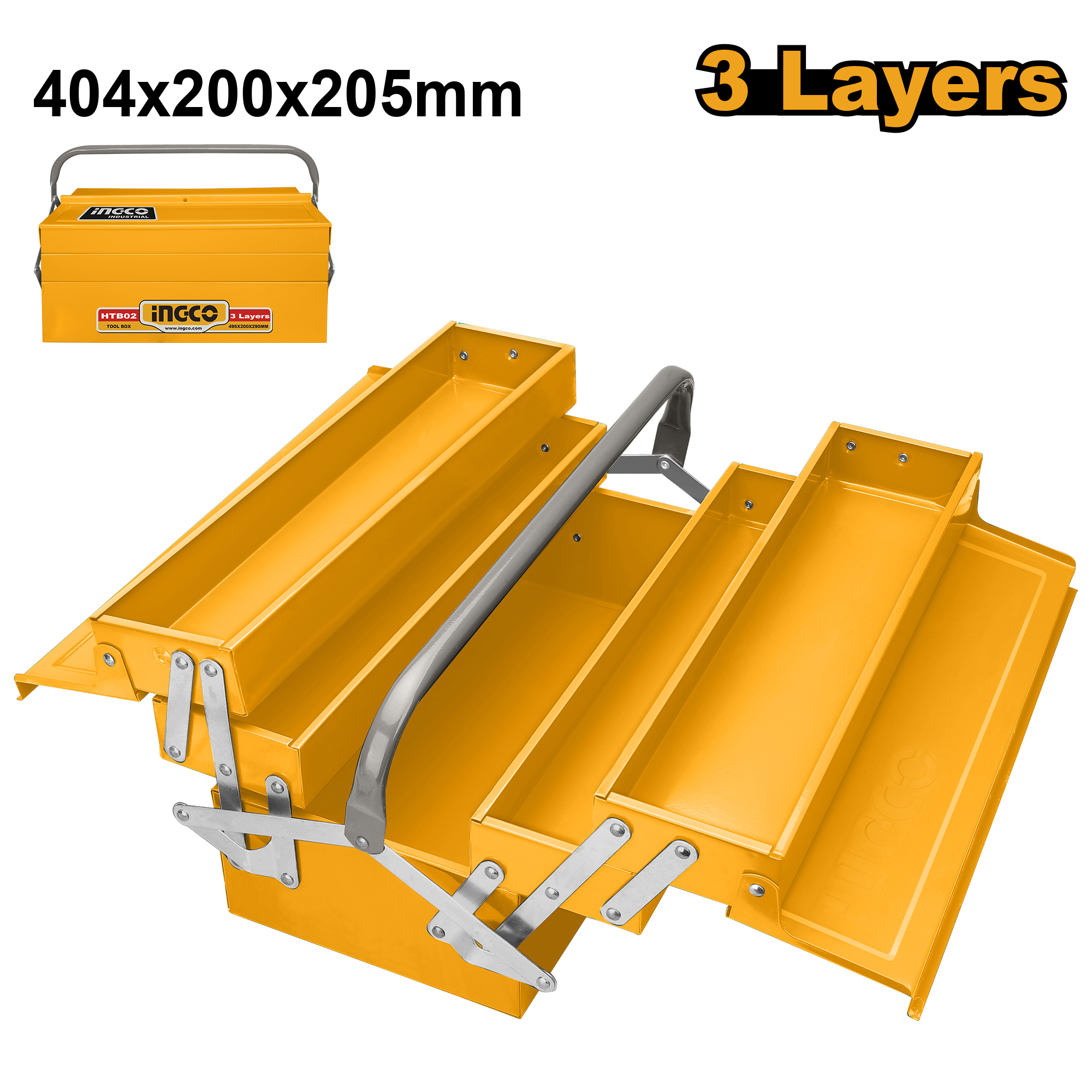 The INGCO HTB03 Tool Box offers a durable 3-layer steel design with a compact size of 404×200×205mm — perfect for organized and secure tool storage.